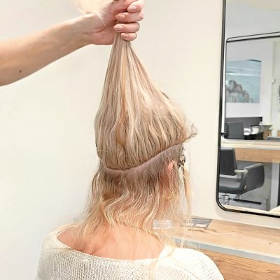 Je nach Haarbeschaffenheit und Frisurwunsch gibt es mehrere Möglichkeiten, die Extensions zu befestigen. Eine Variante ist die Einarbeitung mit schonenden Kupferhülsen und Microringen – eine Weavingmethode, die oftmals auch bei schwierigem Haar zum Einsatz kommt. Das Haar kann mehrfach verwendet werden.